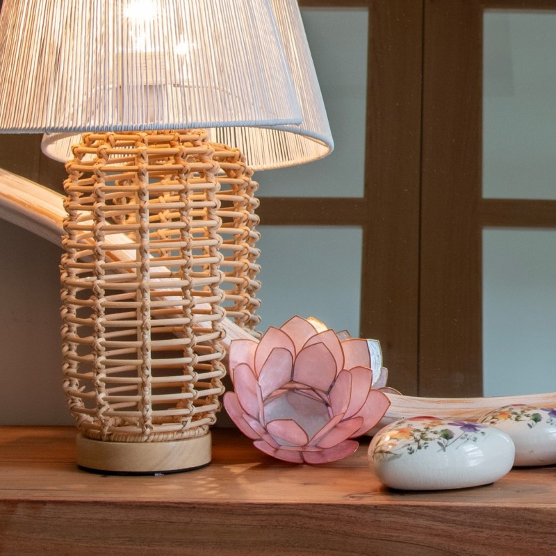 Decora tu hogar con la magia y el simbolismo de la Flor de Loto con este hermoso portavelas artesanal hecho en conchas de Capiz. Cada pieza es elaborada pétalo a pétalo con mimo y atención al detalle, creando una flor abierta de tres hojas con bordes dorados que aportan un toque elegante y luminoso.