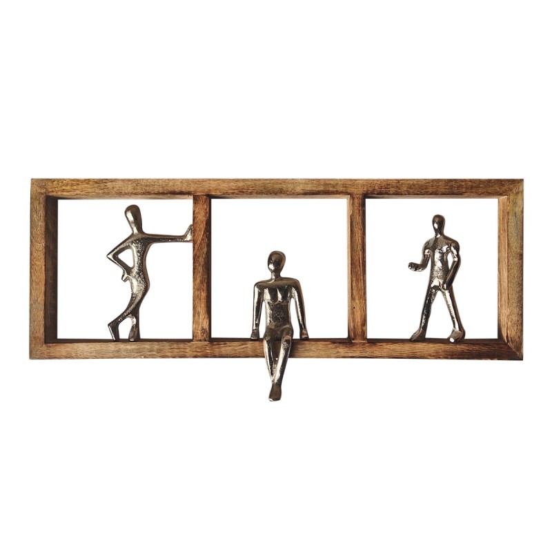 Este adorno de pared combina aluminio moldeado y madera de mango para crear una pieza decorativa con estilo y personalidad. Su diseño de figuras estilizadas aporta dinamismo y un toque artístico que encaja perfectamente en ambientes modernos o naturales.
