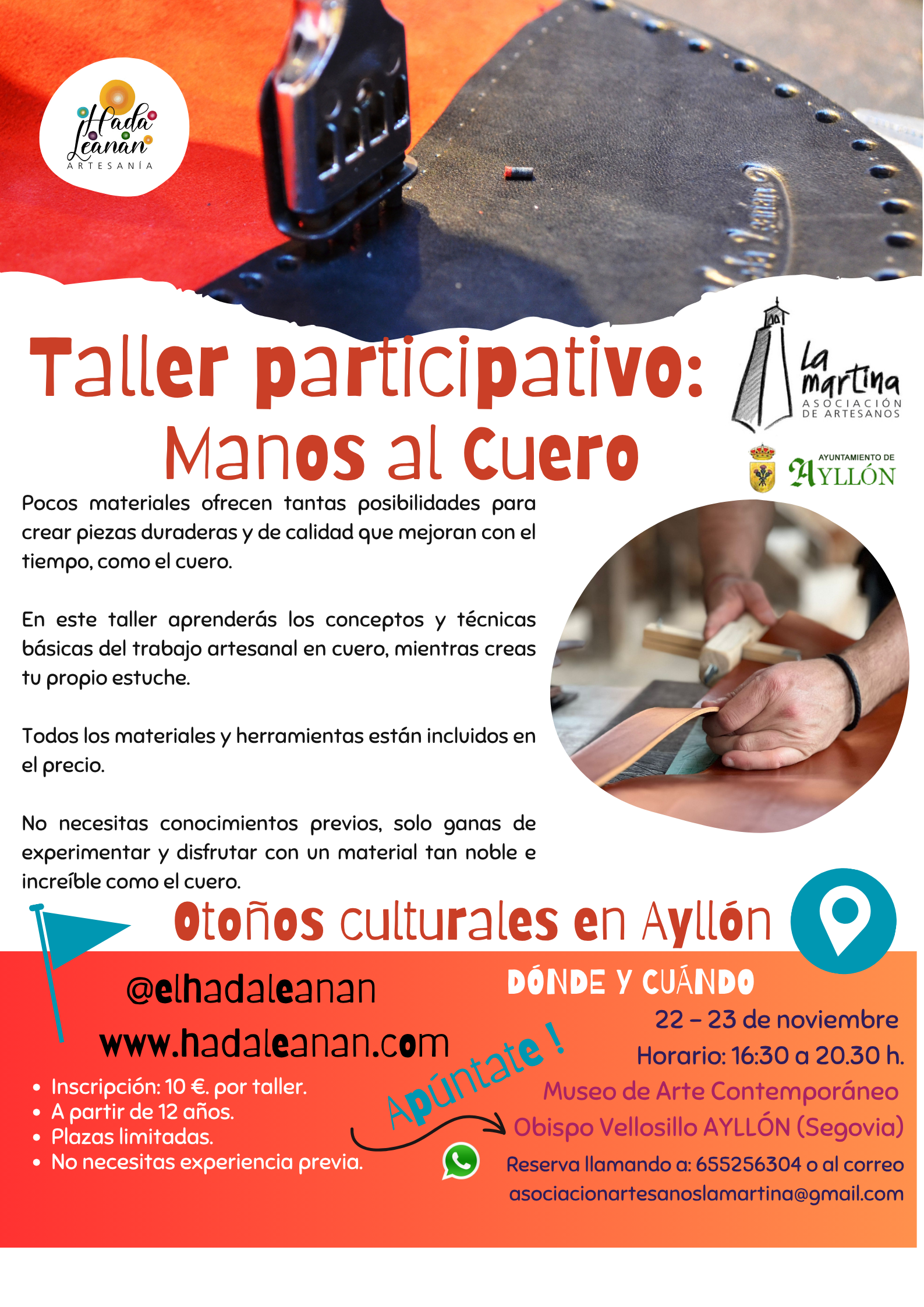 Del 8 al 30 de noviembre se celebran las Jornadas de Oficios Artesanos 2025, organizadas por la Asociación de Artesanos La Martina, y en ellas participaremos con nuestro taller “Manos al cuero: crea tu propio estuche”.