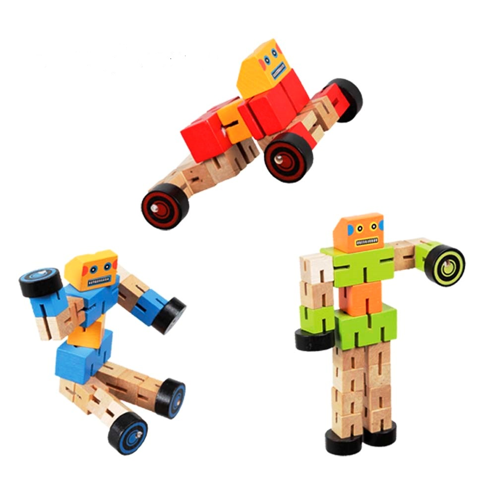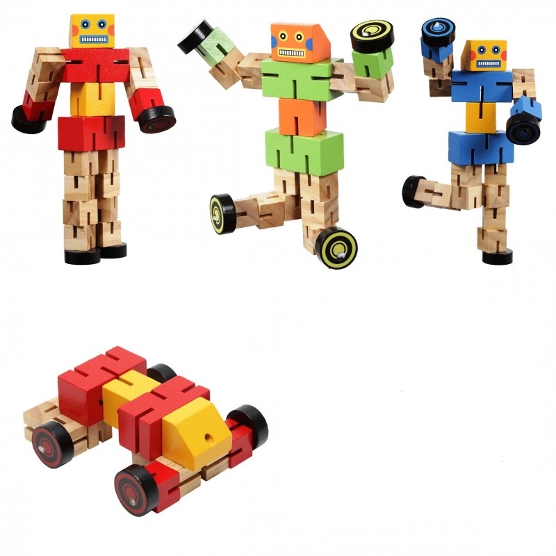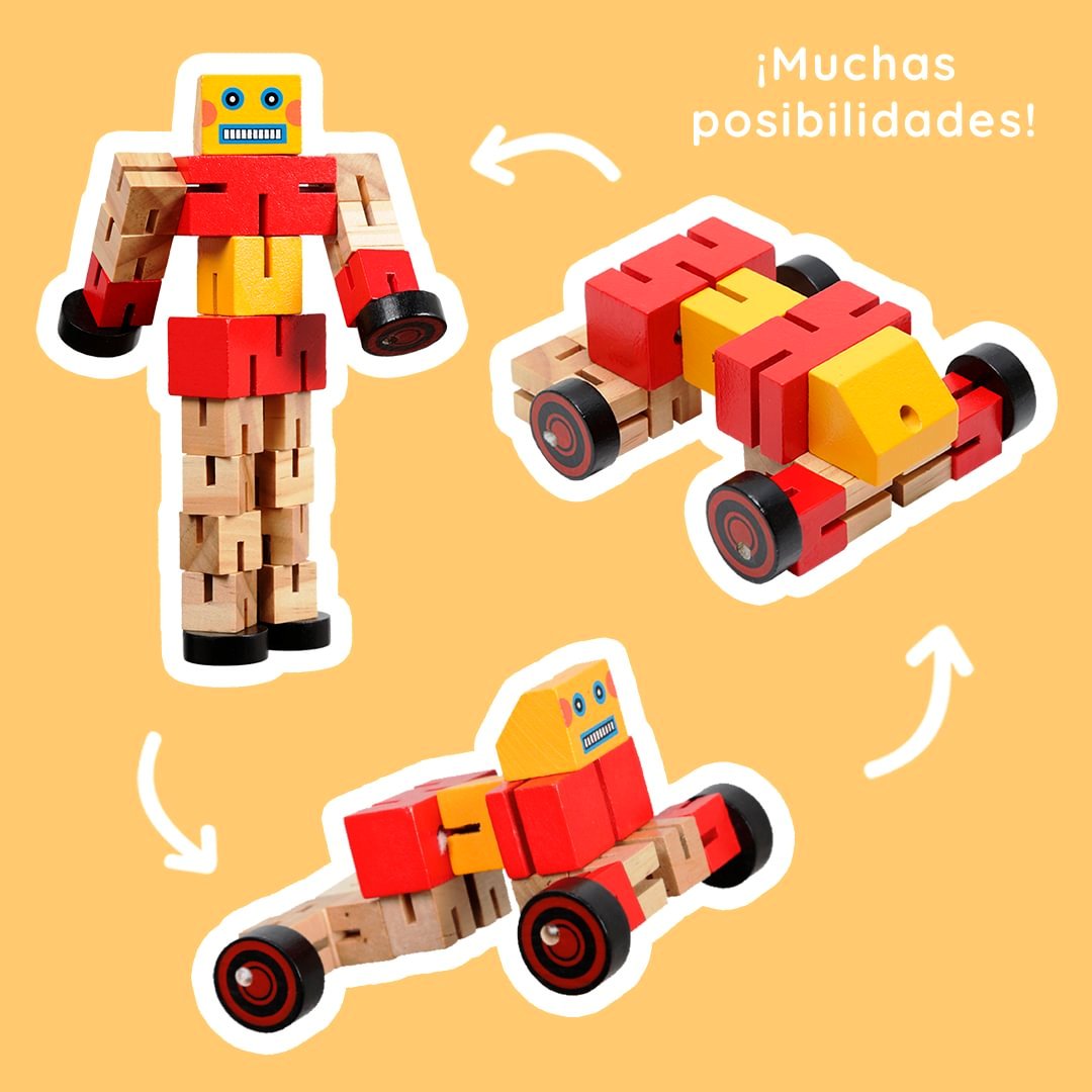 Simpáticos muñequitos de madera con forma de robot tipo 'Transformers', cuyas articulaciones pueden moverse para que adopten la forma de un coche de manera fácil y segura para los niños, sin que se rompan las piezas.