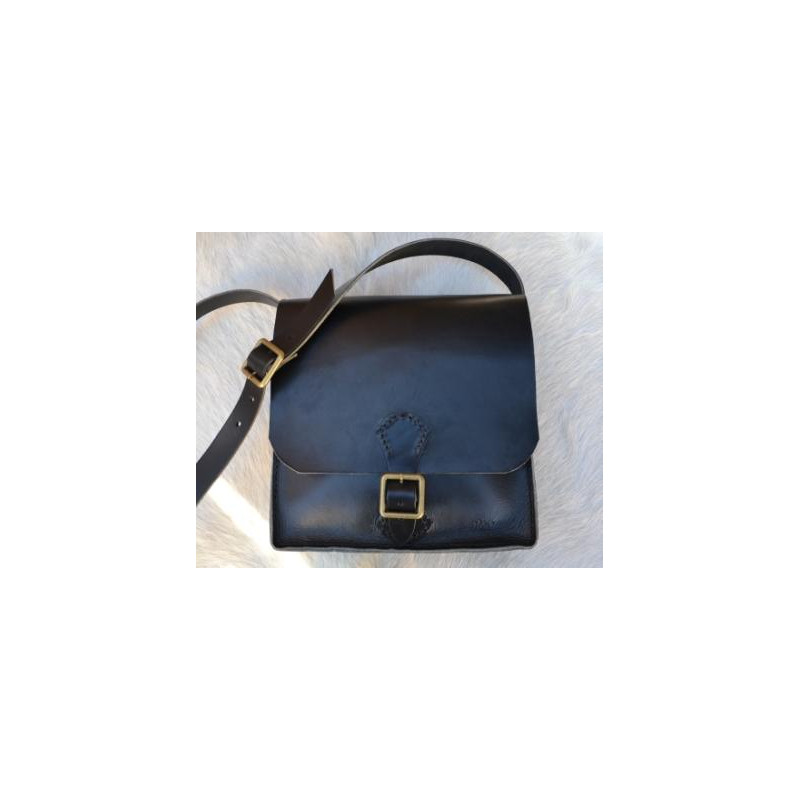 Bolso bandolera con correa ajustable mediante hebilla, hecho a mano en piel vacuno. Bolsillo con cremallera en el interior. Cosido a mano. Se puede hacer en varios colores: marrón avellana, marrón chocolate, rojo, morado, verde, negro ... Dimensiones: 22 X 20 x 6 cm.