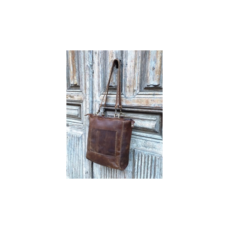 Bolso bandolera con correa ajustable mediante hebilla, hecho a mano en piel vacuno. Cosido a mano. Se puede hacer en varios colores: marrón avellana, marrón chocolate, rojo, morado, verde, negro, … Dimensiones: 30 x 30 x 2 cm.