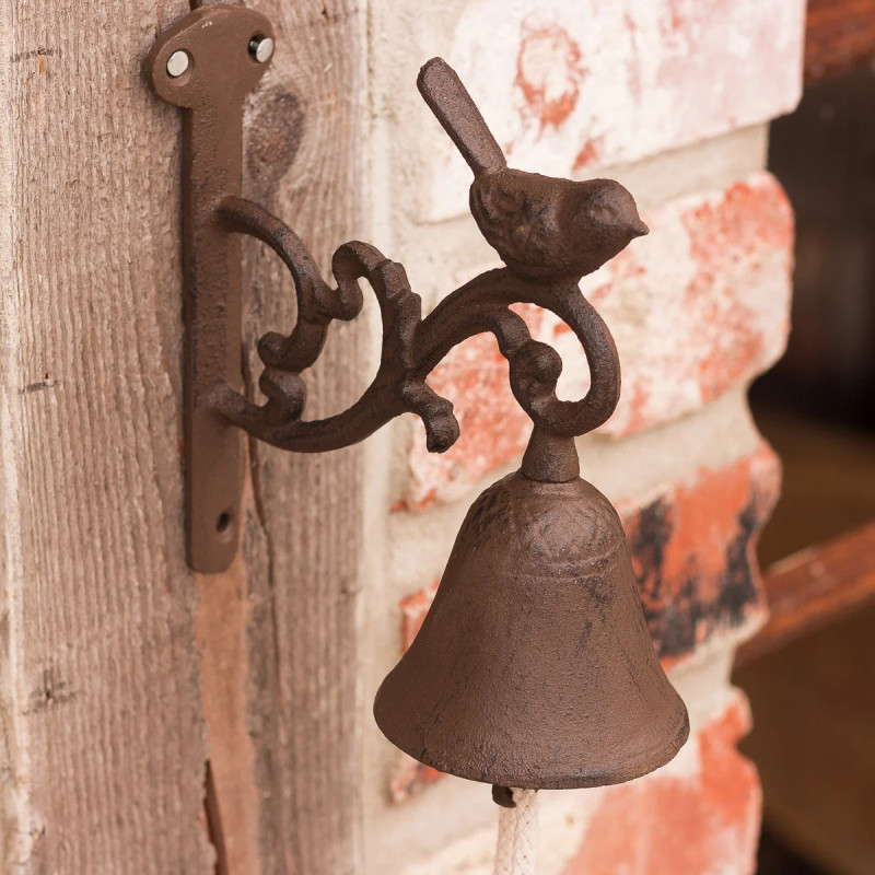Esta campana con forma de pájaro, hecha de hierro fundido con un acabado de óxido envejecido, no solo añade un elemento decorativo, sino que también proporciona una función práctica con su timbre.