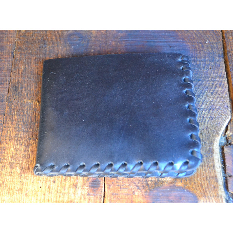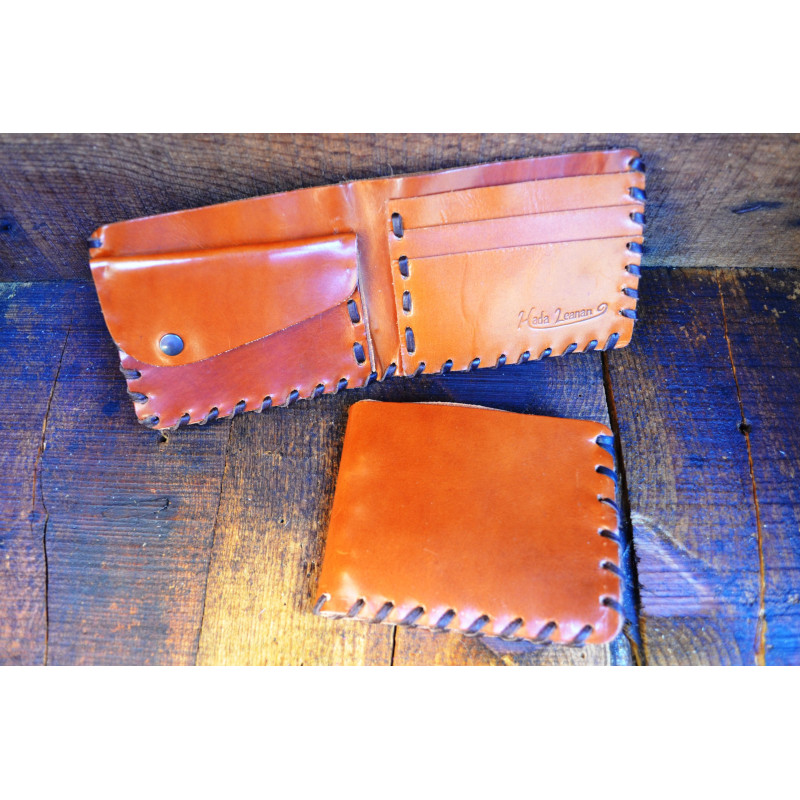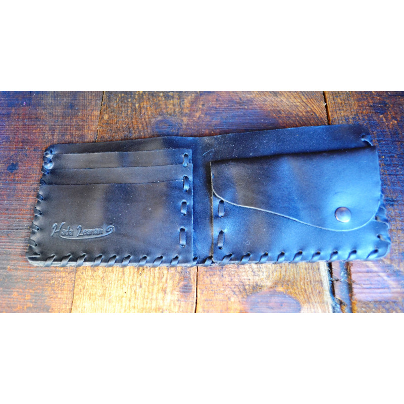 Hecha a mano y cosida con tireta de cuero, con billetero, monedero y tarjetero. También la podemos hacer sin monedero. (sustituyéndolo por tarjetero). Se puede hacer en varios colores: marrón avellana, marrón chocolate, negro, y combinada. Dimensiones: 10.5 x 7 cm. (cerrada) / 15 x 7 cm. (abierta)