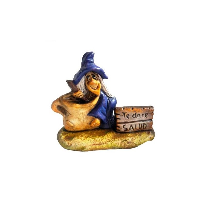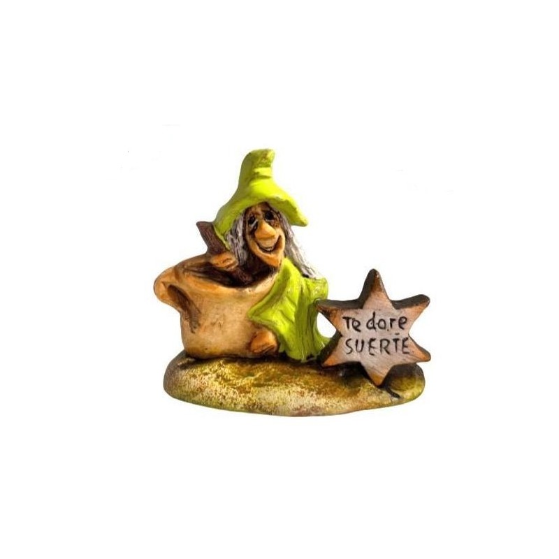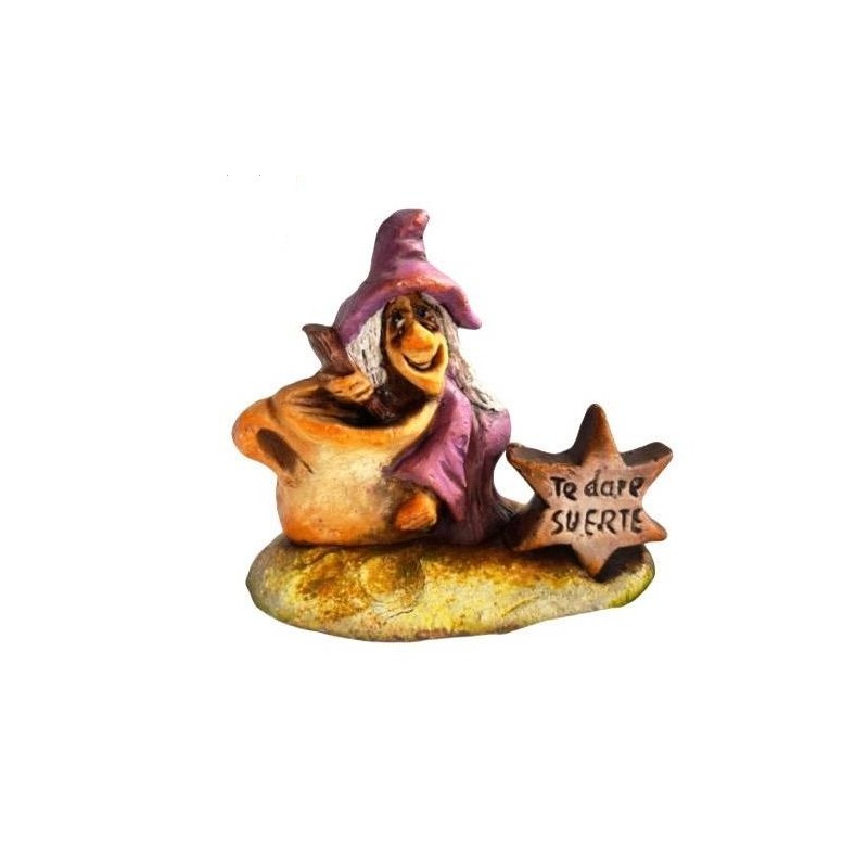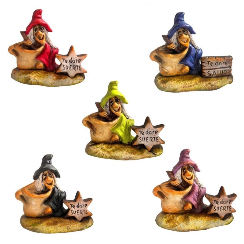 Con una altura aproximada de 9 cm, estas brujitas son perfectas para decorar cualquier rincón del hogar, colocar en estanterías, escritorios o como detalle especial lleno de buenas energías. Cada figura incluye un cartel con mensaje a elegir: “Te daré salud” o “Te daré suerte”, convirtiéndolas en un pequeño amuleto artesanal.
