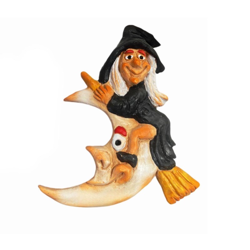 Figura de cerámica artesanal: bruja sobre luna, hecha a mano en España.