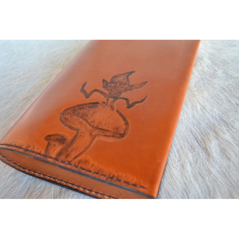 Funda artesanal de piel de primera calidad, cosida a mano y decorada con dibujo pirograbado.