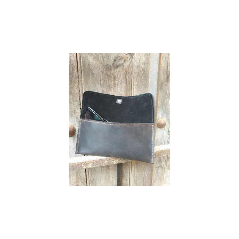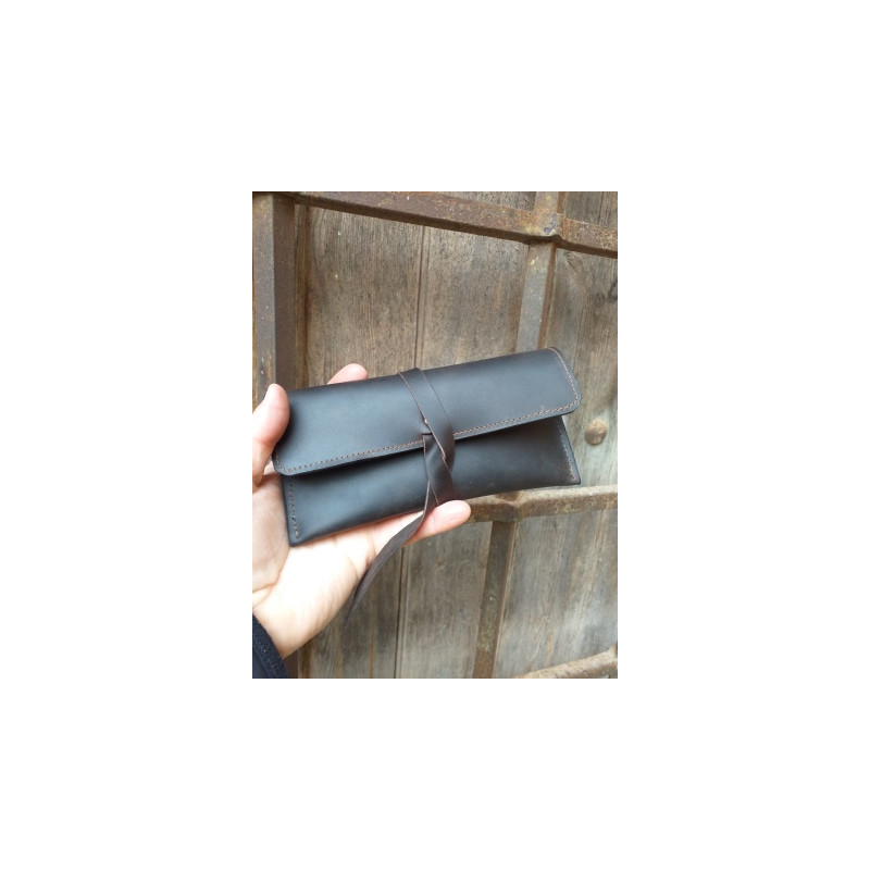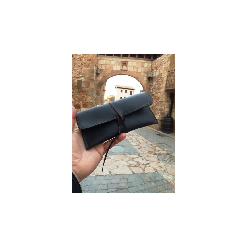 Con unas dimensiones de 18,5 x 9 cm aprox., es perfecta para guardar en el bolso, mochila o en la guantera del coche. Disponible en varios colores (marrón avellana, marrón chocolate, rojo, morado, verde, negro…), cada funda es una pieza única y exclusiva.