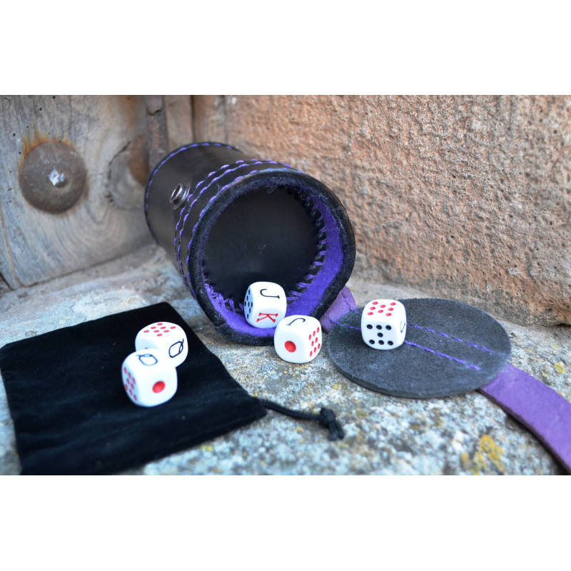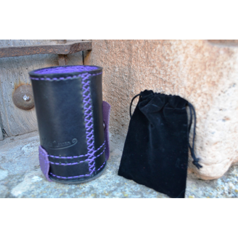 Hecho a mano en piel vacuno de primera calidad, este cubilete cosido con tireta de cuero cuenta con un departamento integrado para guardar los dados.