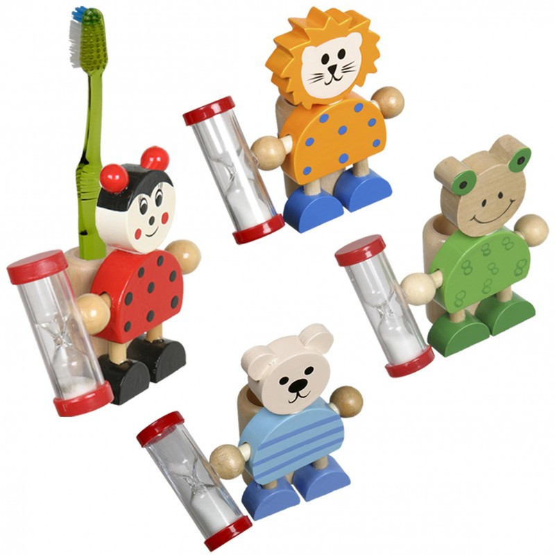 Porta cepillo con reloj de arena Estos simpáticos animales controlarán el tiempo de cepillado de los pequeños de la casa. Porta cepillo infantil para los más peques, incluye un reloj de arena con el que pueden medir el tiempo óptimo que deben estar cepillándose sus dientecitos. Está decorado con figuras de animalitos: mariquitas, leones, ranas y ositos, en divertidos colores. No incluye cepillo de dientes. Dimensiones: 8'5 cm.