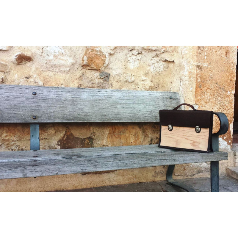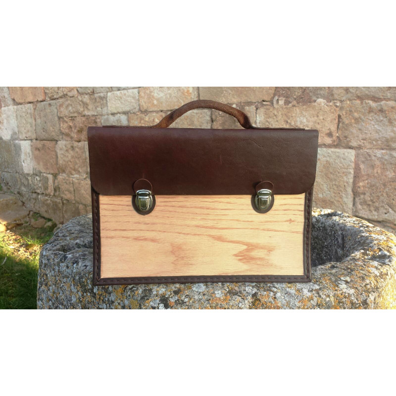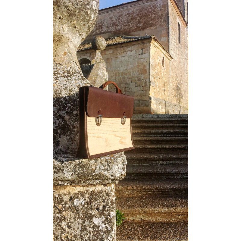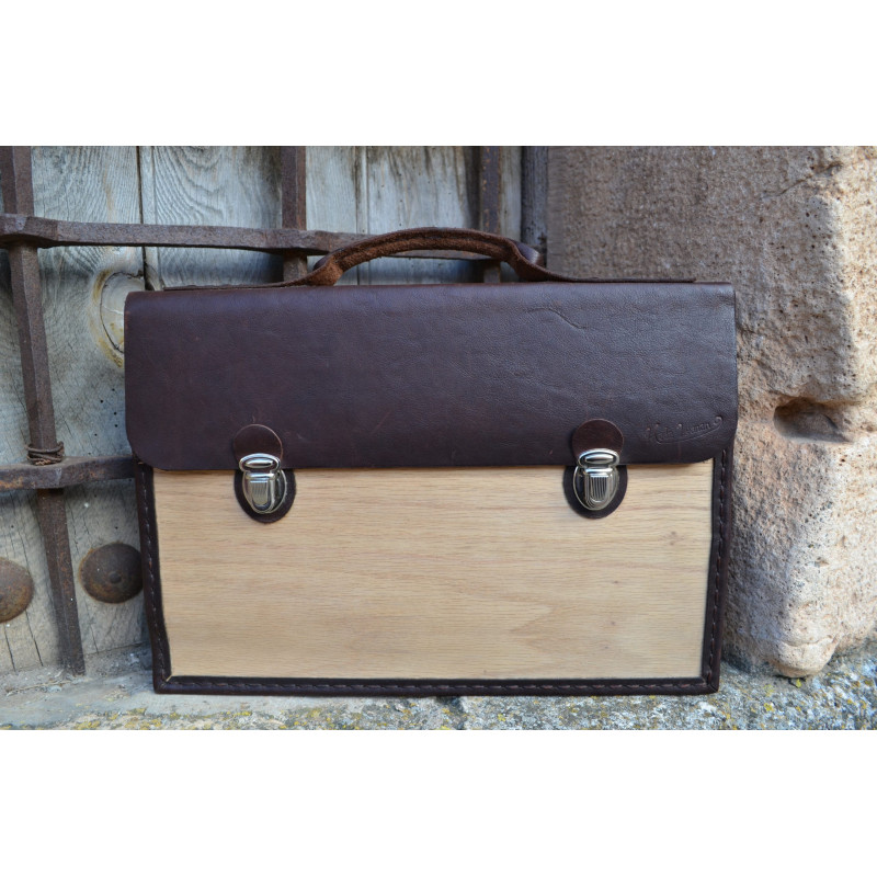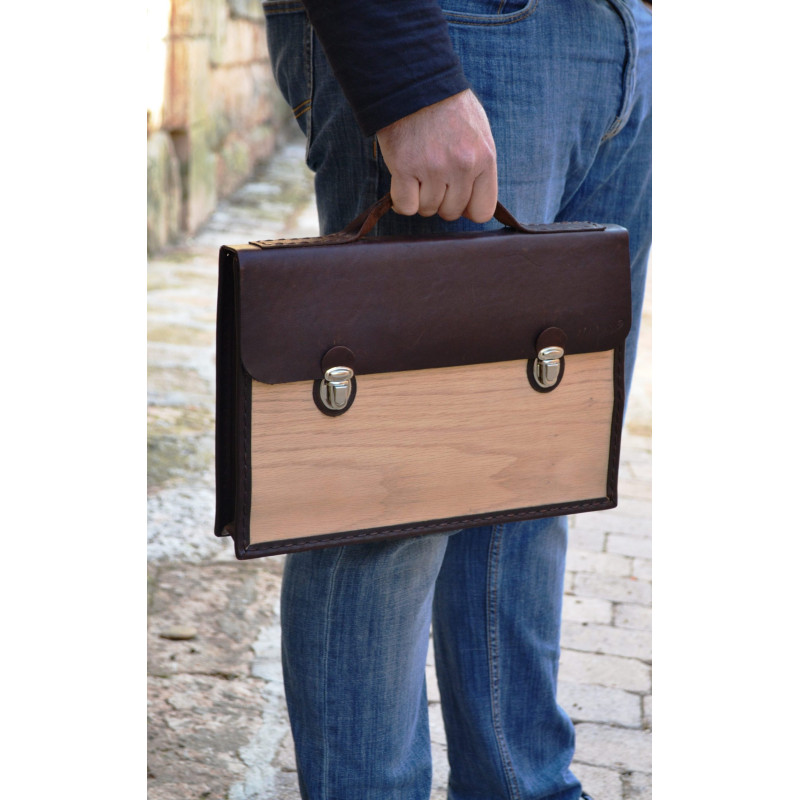 Maletín de cuero hecho a mano en piel vacuno de primera calidad, y combinado con madera. Cosido con hilo encerado y cierre con doble hebilla. Dispone de asa de mano y dos departamentos interiores individuales, para portátil y documentación. Se puede hacer en diferentes colores para que puedes llevarlo totalmente personalizado. Dimensiones: 34 x 24 x 5 cms.