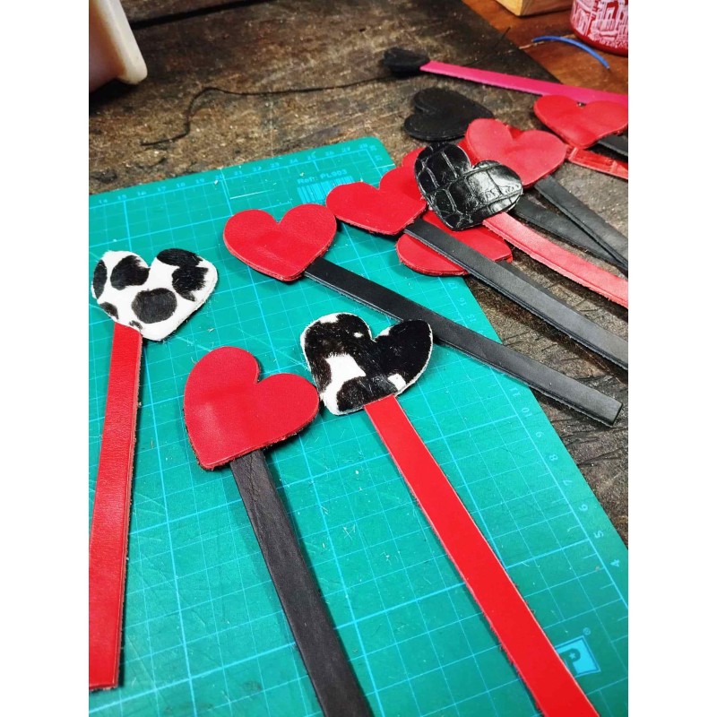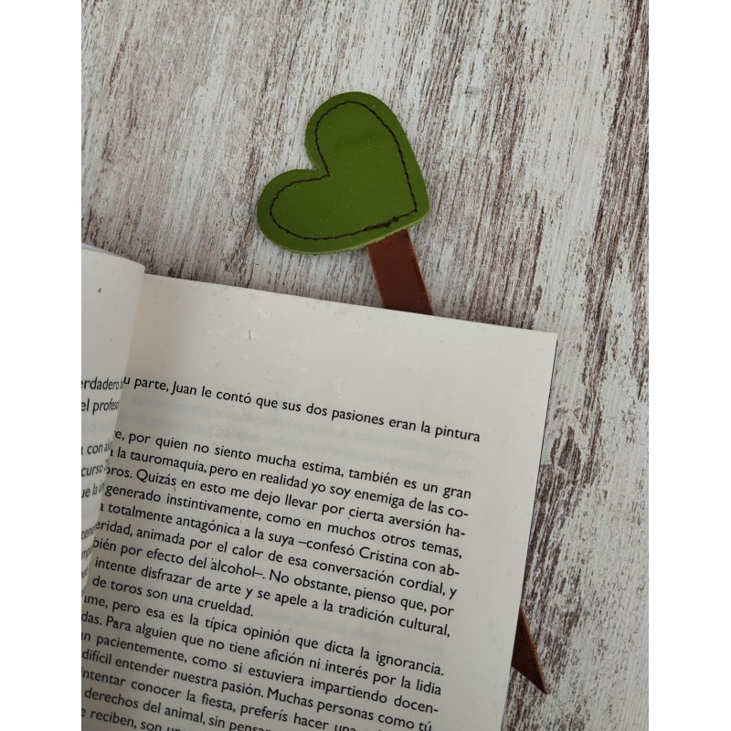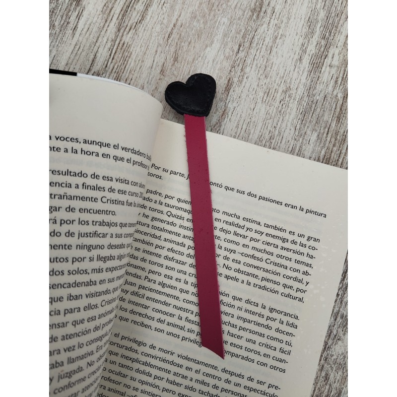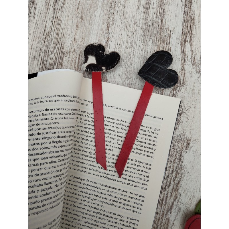 Su forma alargada permite marcar la página cómodamente, mientras que el corazón de cuero, disponible en dos tamaños, aporta un toque especial y lleno de significado. Cada pieza es única, pensada para durar y envejecer con carácter.