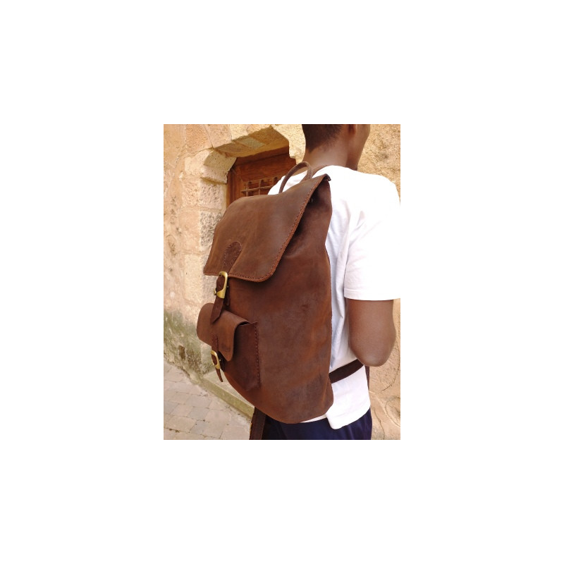 Mochila de cuero, hecha a mano en piel vacuno de primera calidad. Bolsillo interior sin cremallera y bolsillo delantero. Muy cómoda y práctica para el día a día. Dimensiones: 45 x 30 cms. aprox.
