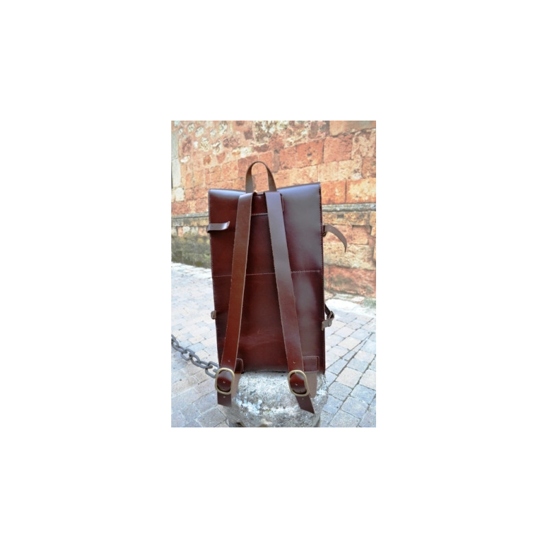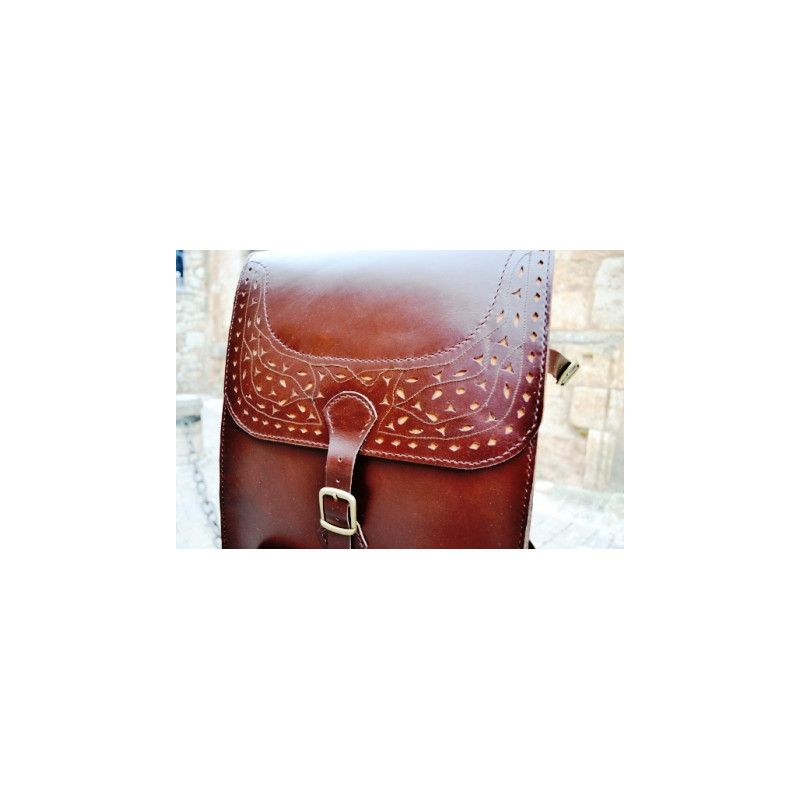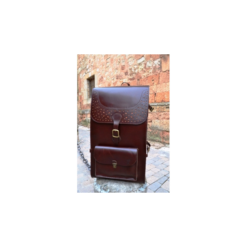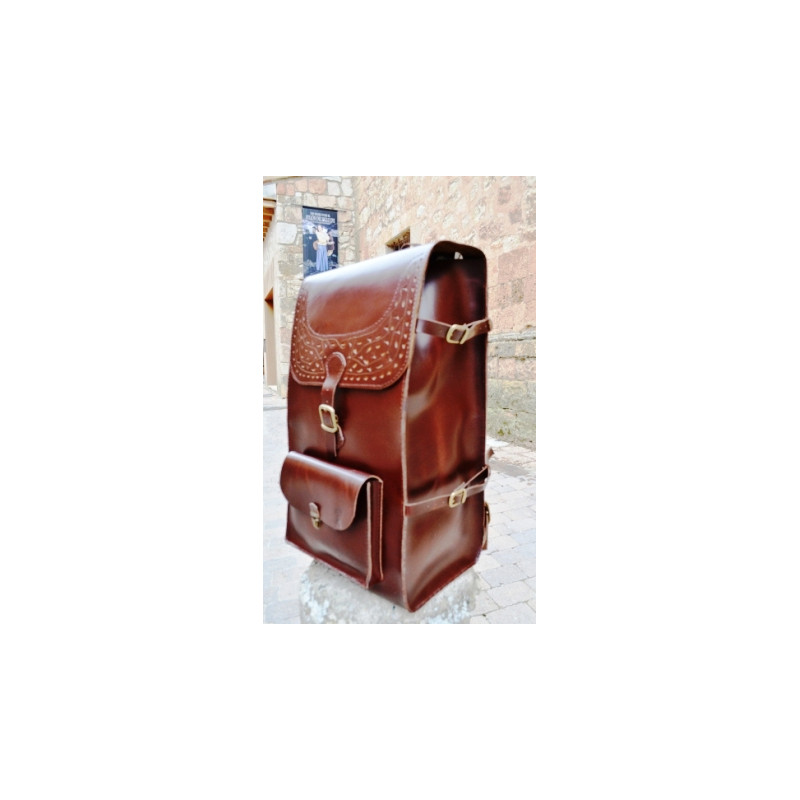 Mochila de cuero, hecha a mano en piel vacuno de primera calidad. Bolsillo delantero y departamento interior. Tiras laterales y en la parte inferior. Dimensiones: 60 x 35 x 25 cms.