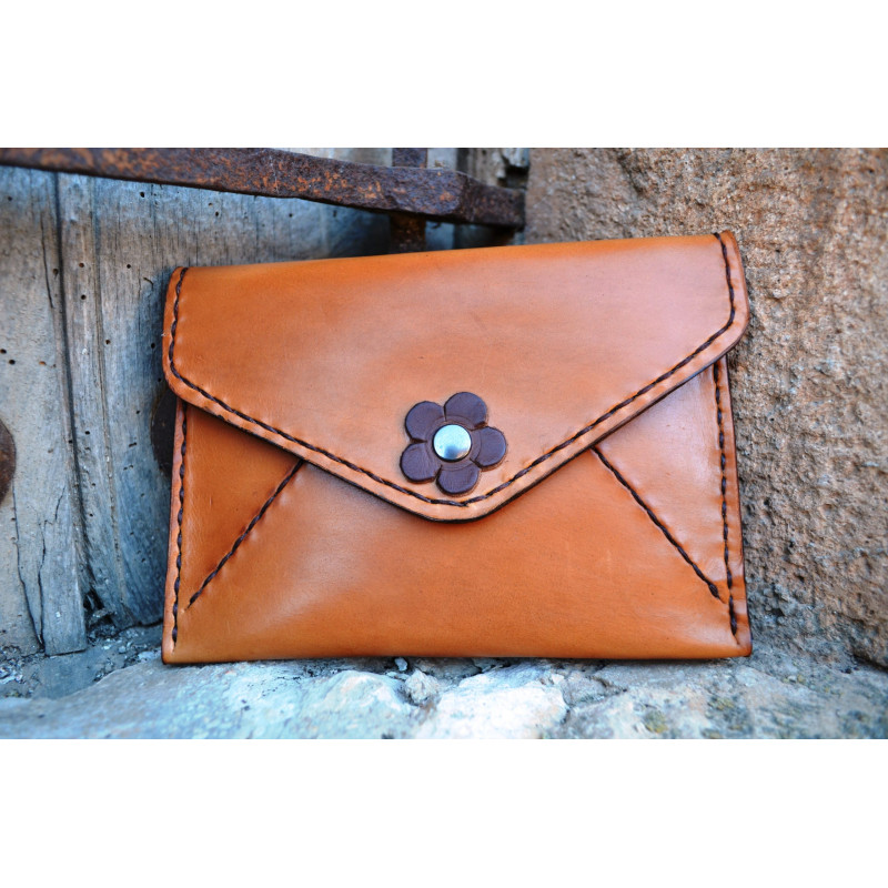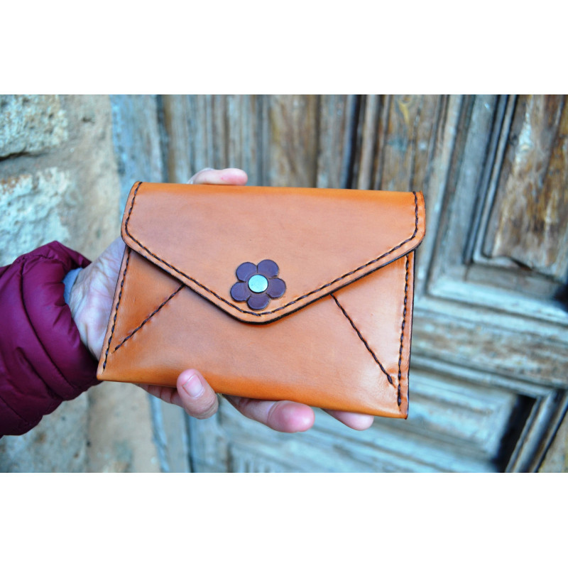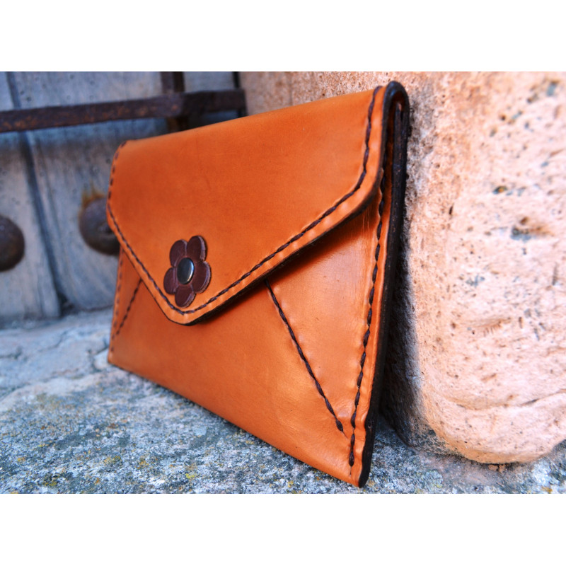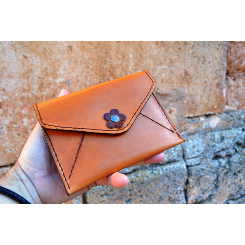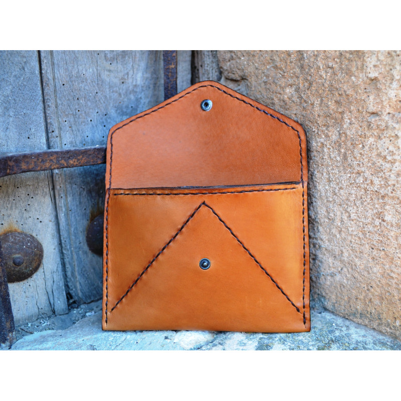 Monedero de cuero, hecho a mano con piel vacuno de primera calidad, con cierre mediante solapa con corchete.