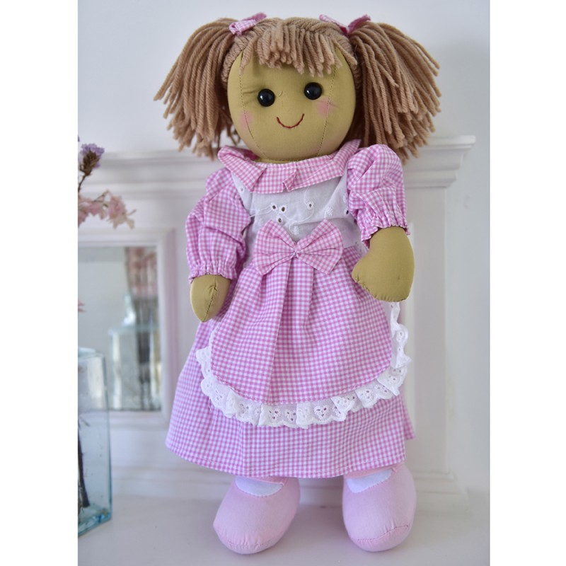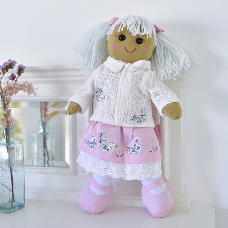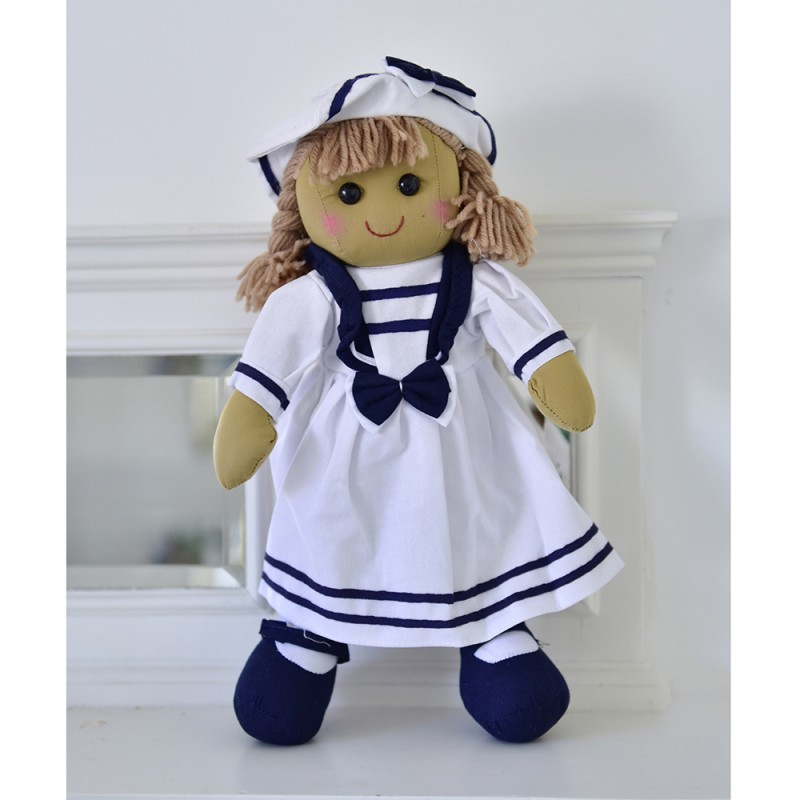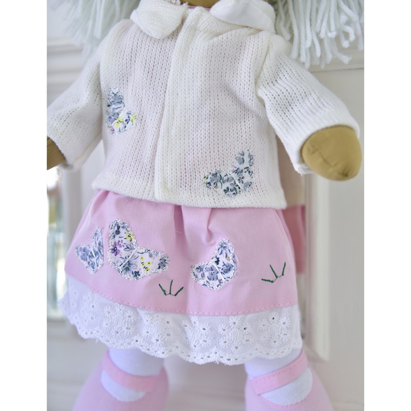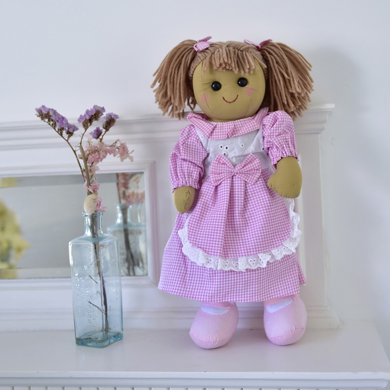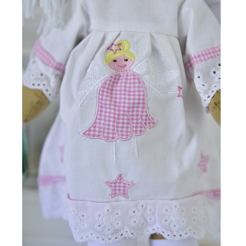 Esta muñeca de trapo de estilo clásico está elaborada con materiales de primera calidad y cuidada hasta el último detalle. Su exterior es de algodón 100 % y su interior de fibra hueca, lo que la hace especialmente suave, ligera y agradable al tacto. Su acabado artesanal convierte cada pieza en única.