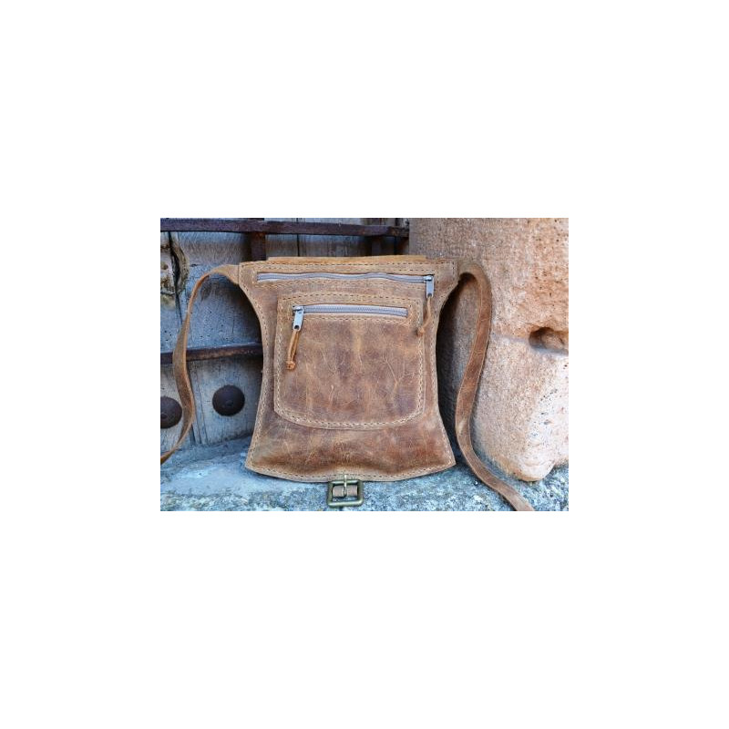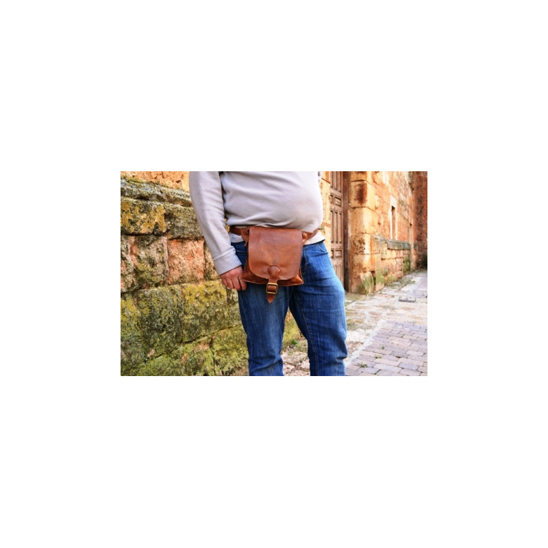 Riñonera de cuero hecha a mano en piel vacuno de primera calidad, cosida con hilo encerado. Dispone de dos compartimentos que cierran mediante cremallera. Solapa exterior cerrada mediante hebilla. Ajustable con cinturón de cuero y hebilla. Posibilidad de hacerla en el color que quieras. Dimensiones: 26 x 20 cms.