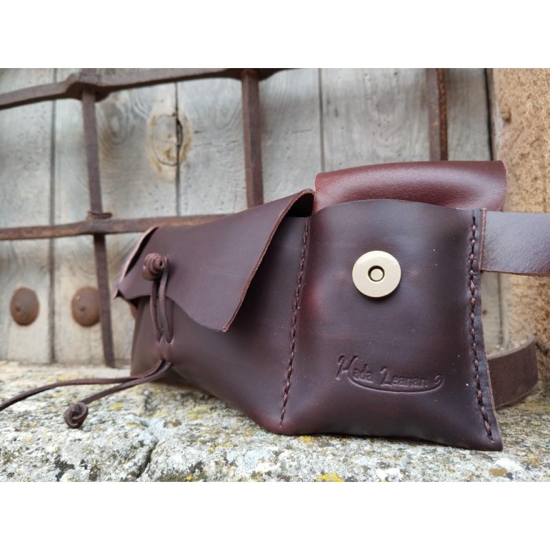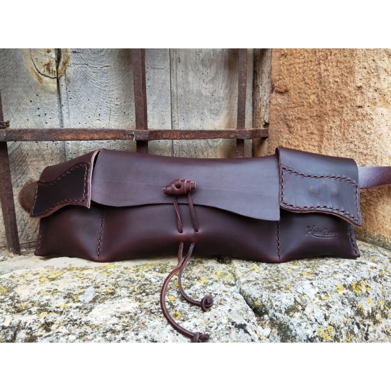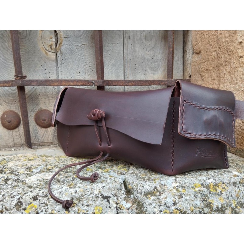 Tres compartimentos, cosida con hilo encerado, ajustable con cinturón de cuero y hebilla.