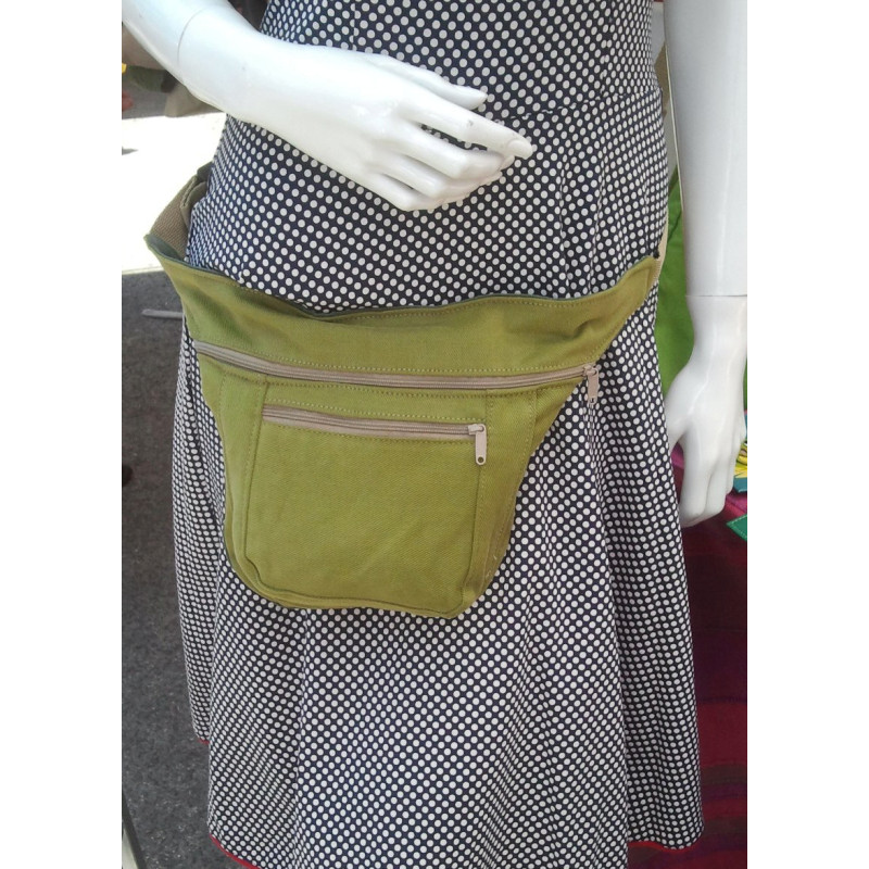 Hechas a mano en loneta de algodón. Bolsillo con cremallera y bolsillo alargado con cremallera en la correa ajustable. Disponibilidad en varios colores.