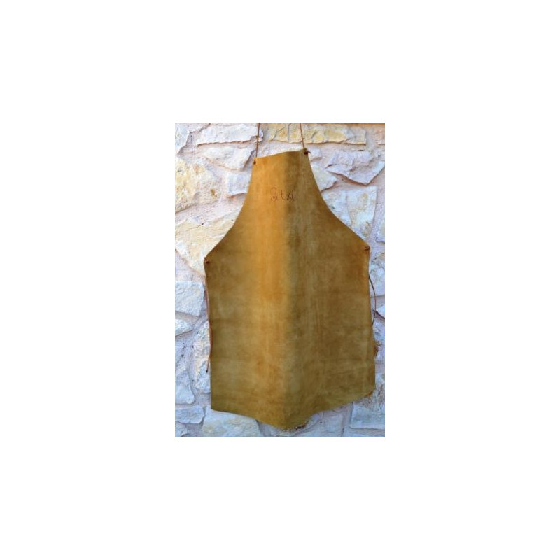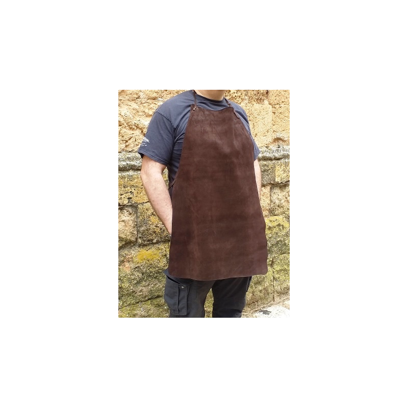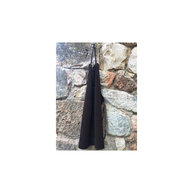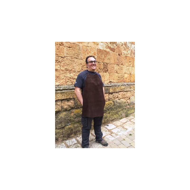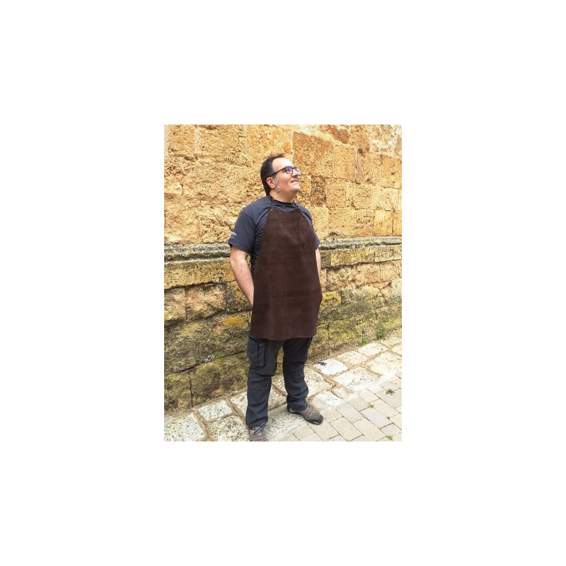 Hecho a mano en piel de serraje de primera calidad. Correa a la cintura y al cuello regulable mediante hebilla.   Medidas: Alto: 80 cm. / Ancho: 60 cm. Se pueden hacer a la medida que desees. También se puede elegir el color que quieras: negro, marrones, rojo, verde,…. Se puede personalizar a tu gusto: añadir bolsillo, grabar nombre….